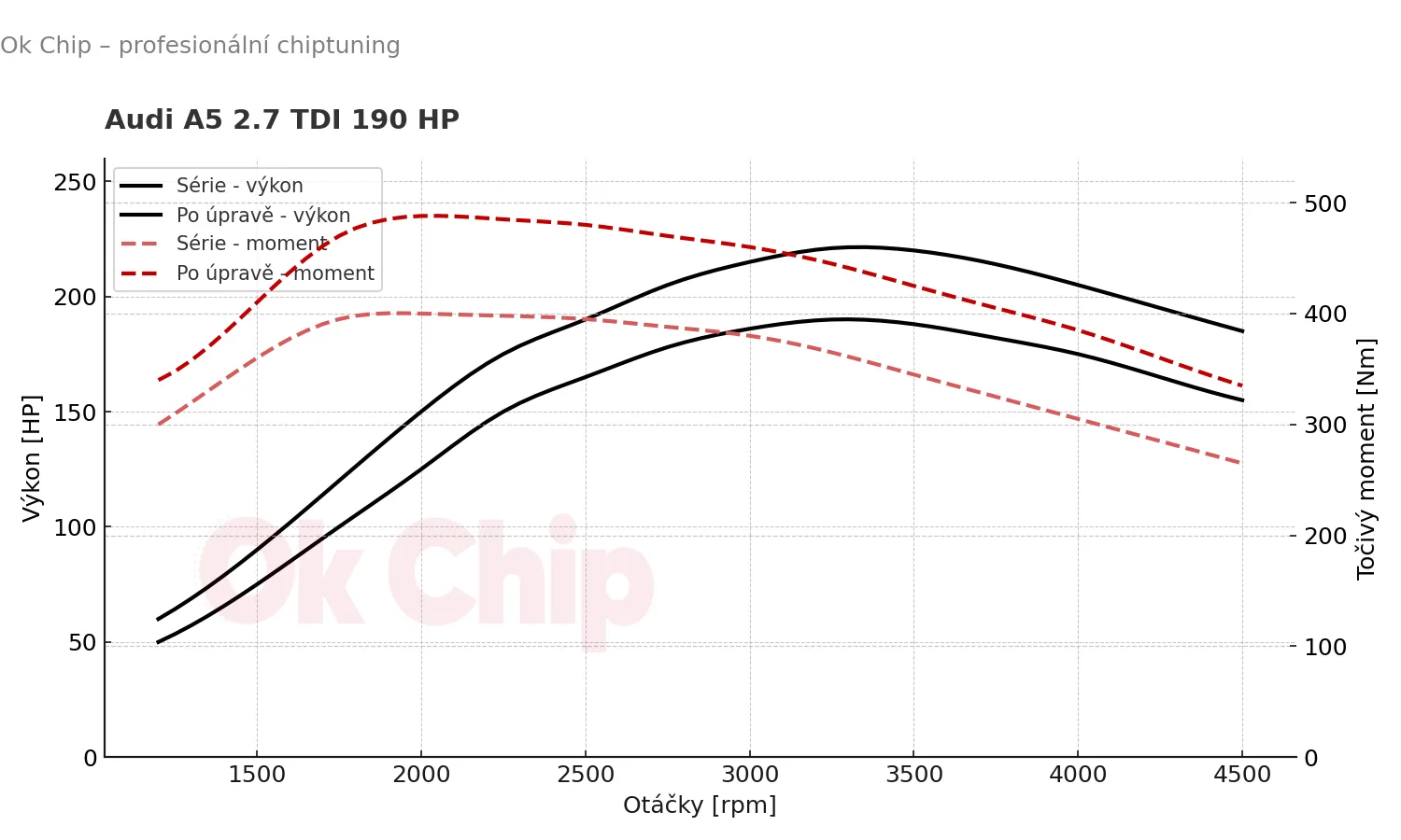 Motor 2.7 TDI V6 je technicky příbuzný s větší verzí 3.0 TDI, a díky robustní konstrukci i kvalitnímu systému vstřikování common-rail snáší zvýšení výkonu s naprostou lehkostí. Úprava probíhá čistě softwarově – bez jakýchkoli mechanických zásahů – takže zůstává zachována spolehlivost i životnost motoru.